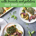 - Arrange salmon filets next to the potatoes and broccoli, and spoon on and spread a tablespoon of pesto to each filet.