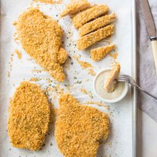 Simply coat your chicken in a flour substitute like arrowroot powder or rice flour, and substitute almond meal, not almond flour, for the panko breadcrumbs, as almond meal has a crispier texture and finish.