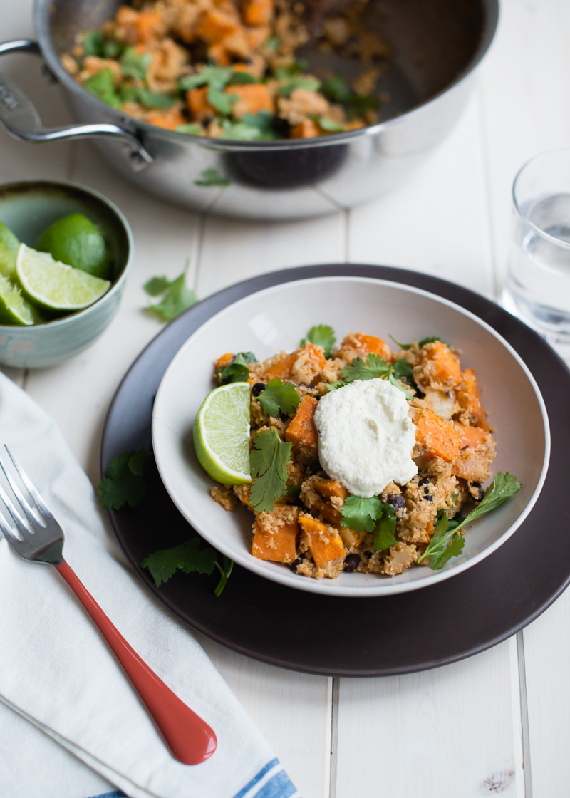 Make The Rice. Heat the remaining coconut oil in a large skillet. Add the diced onion and cook over medium heat until softened, about 5-10 minutes. Add the garlic and cook for 30-60 seconds more. Add the chili powder and cumin. Cook for another 30 seconds or until fragrant. Add the cauliflower and cook, stirring often to prevent burning, for 10 minutes or until just cooked through. If it starts to stick to the bottom, add a little bit of water, but not too much. Add the black beans and roasted sweet potatoes; stir to combine.