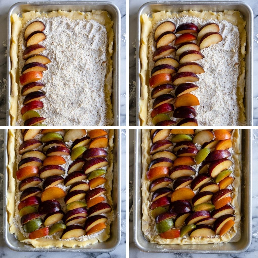 - Arrange the plum slices over the almond mixture. Fold the border of the dough up, pressing and pinching it together to make a rim. Dot the plums with the butter and sprinkle the remaining 2 tablespoon sugar over them. Bake until the filling is bubbly and the crust is golden, about 1 hour.